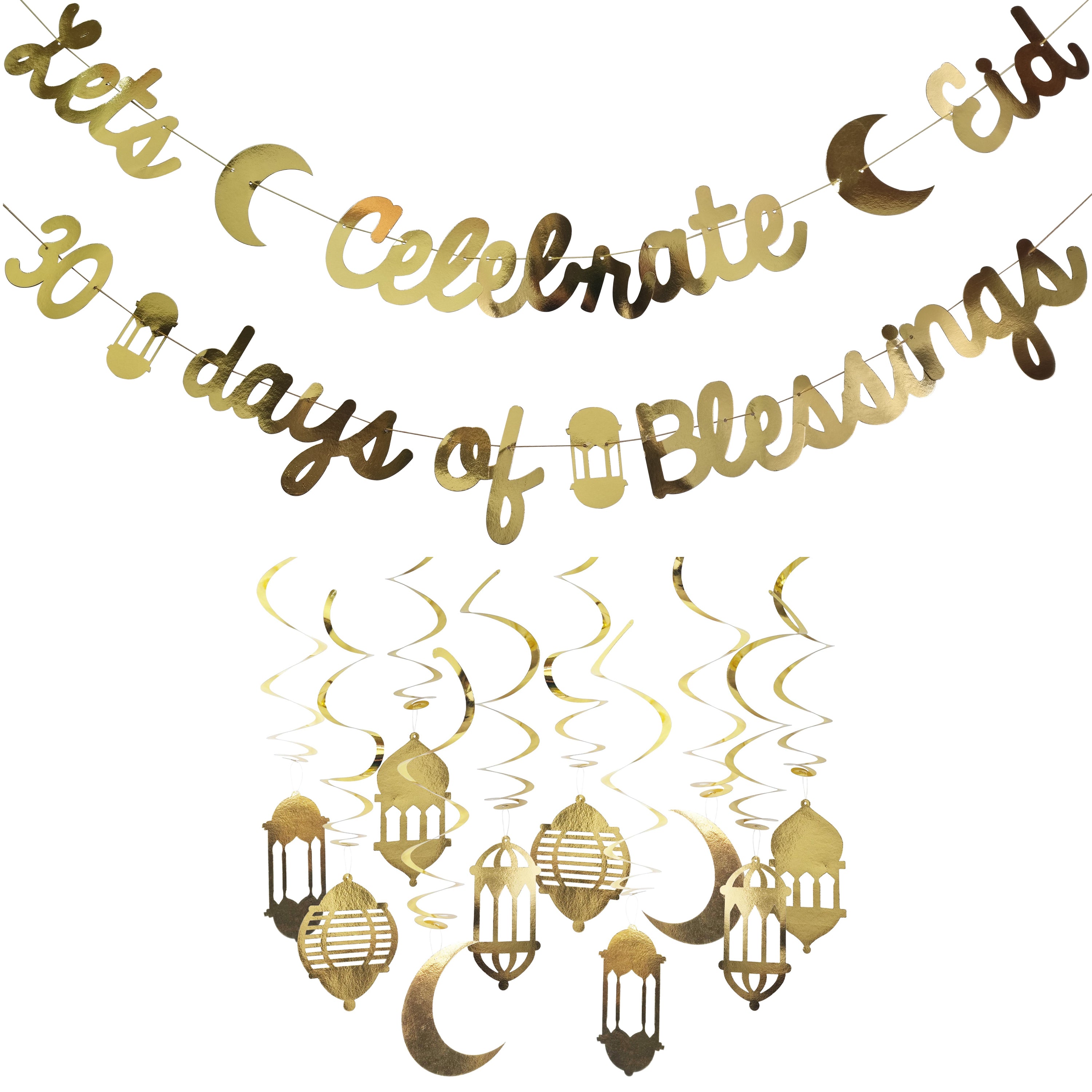 Metallic Gold 'Celebrate' & '30 Days' Garlands & Spiral Lanterns Set (Set 22-3)