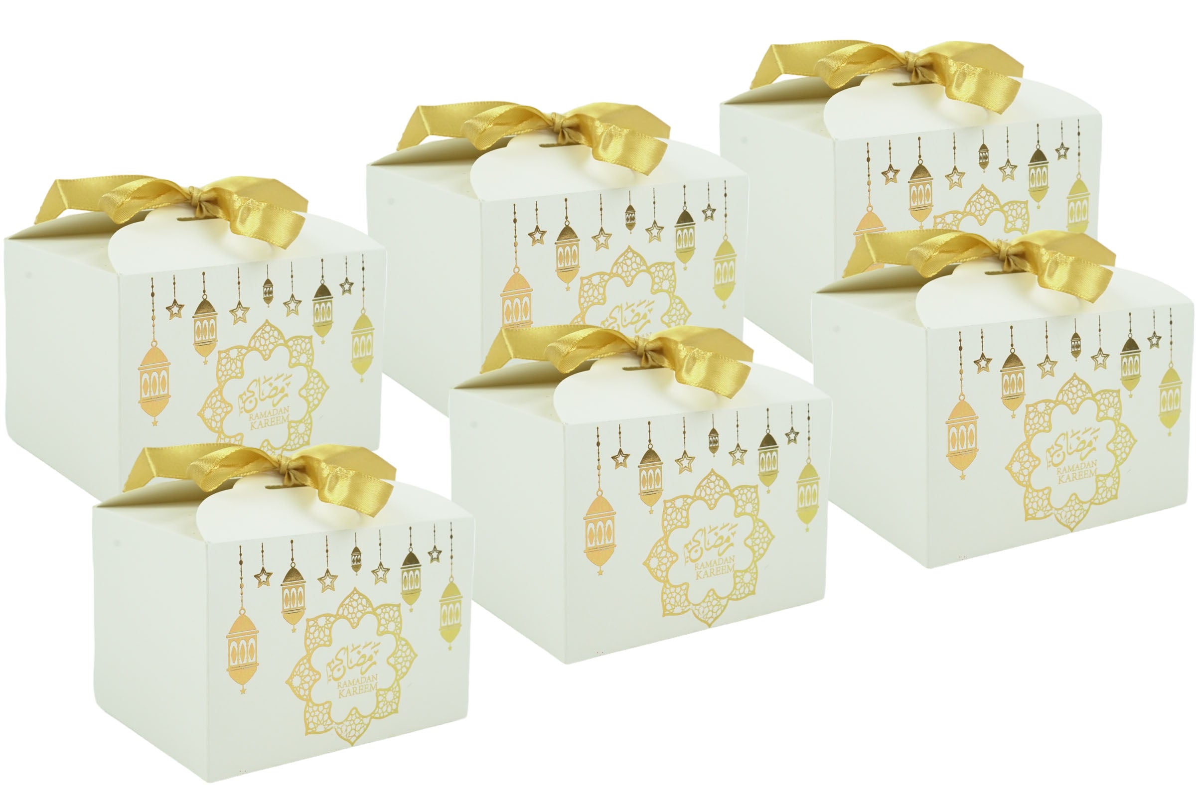 White Metallic Gold Ramadan Kareem Gift Favour Box with Gold Ribbon Pack of 12