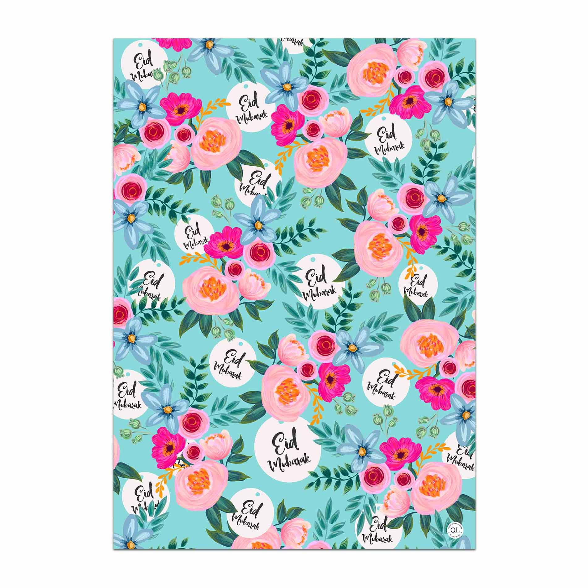 • 5 sheets of turquoise Eid Mubarak wrapping paper with contemporary floral design.