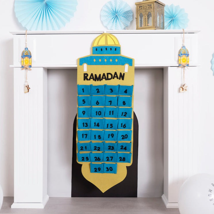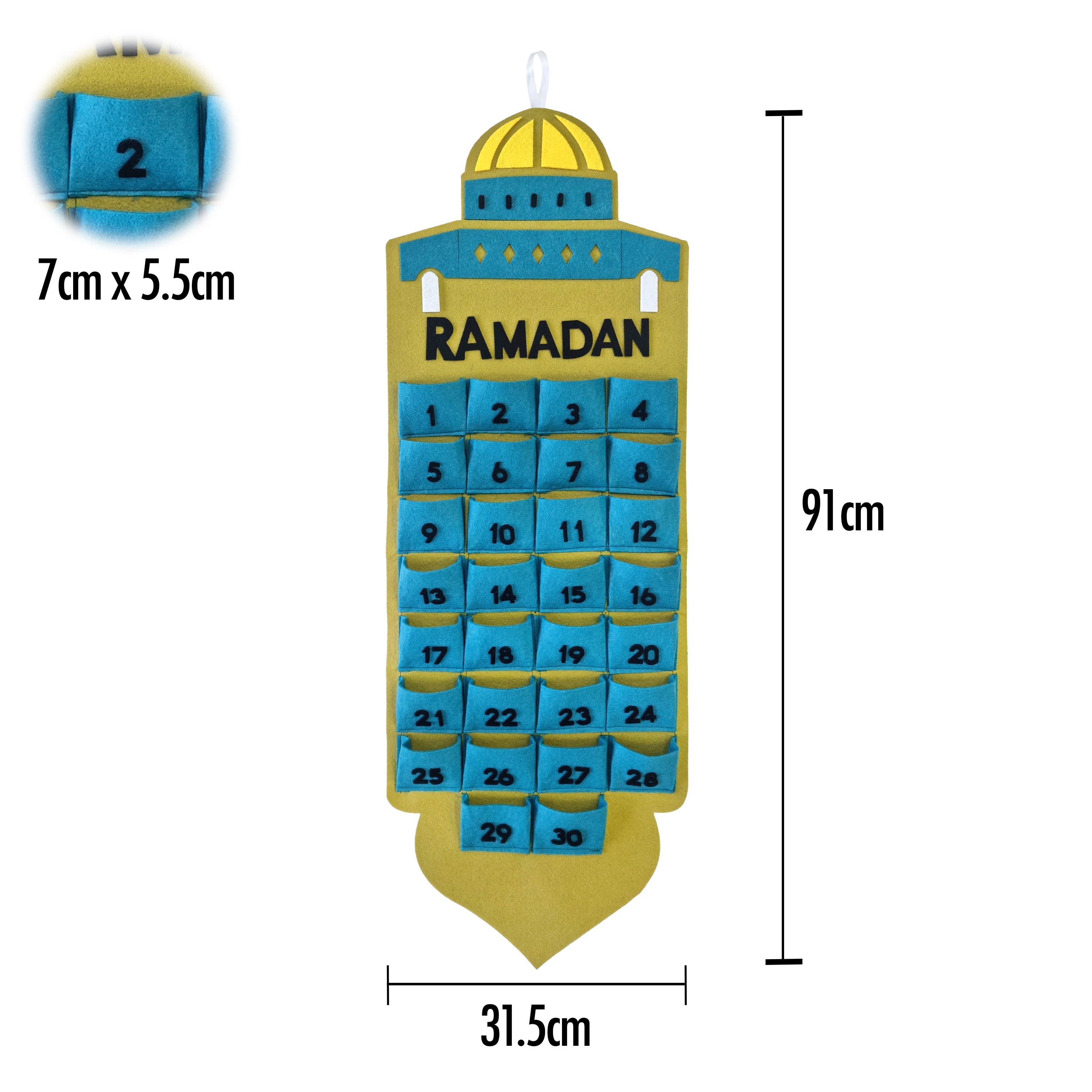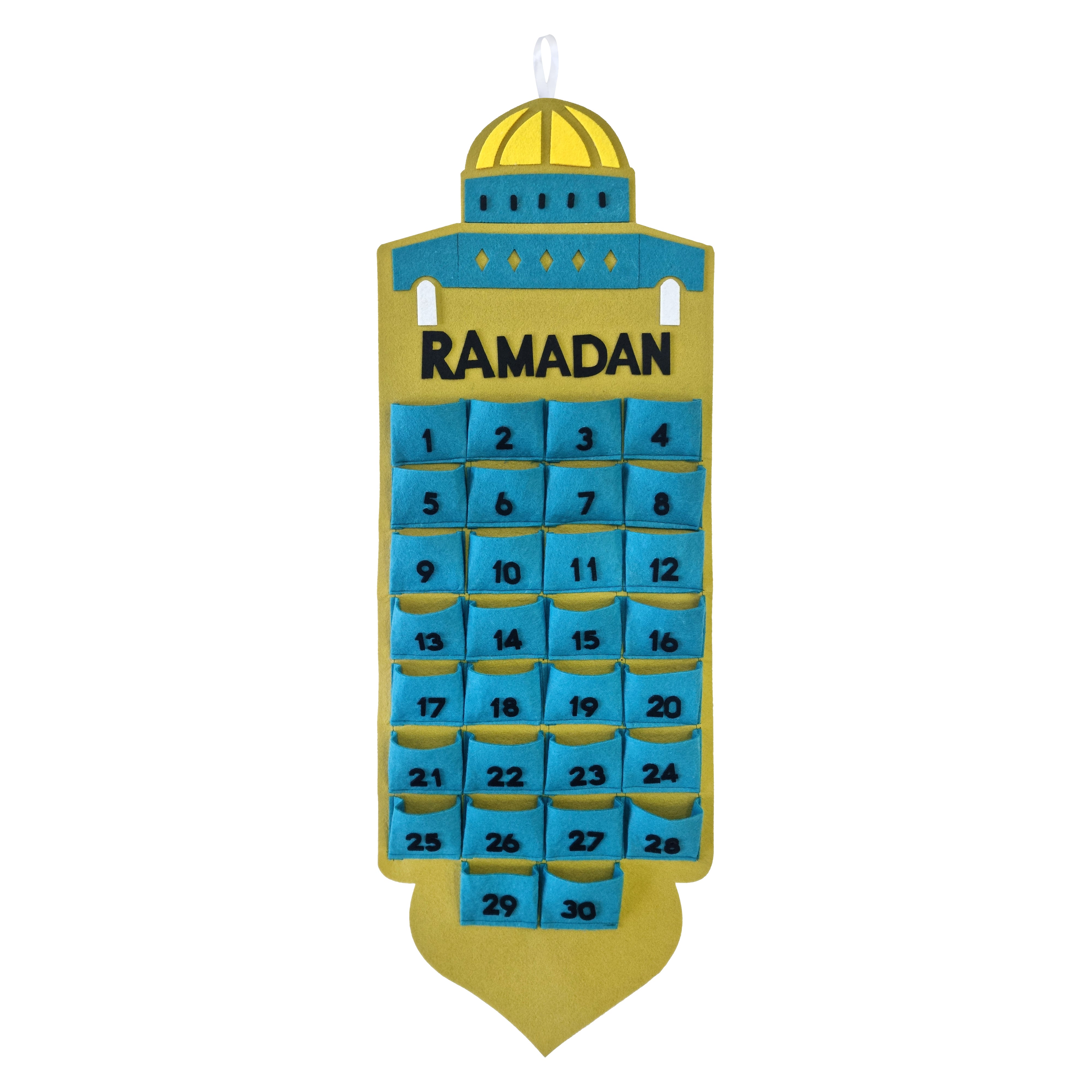 • Large reusable mosque shaped Ramadan felt hanging calendar with numbered pockets