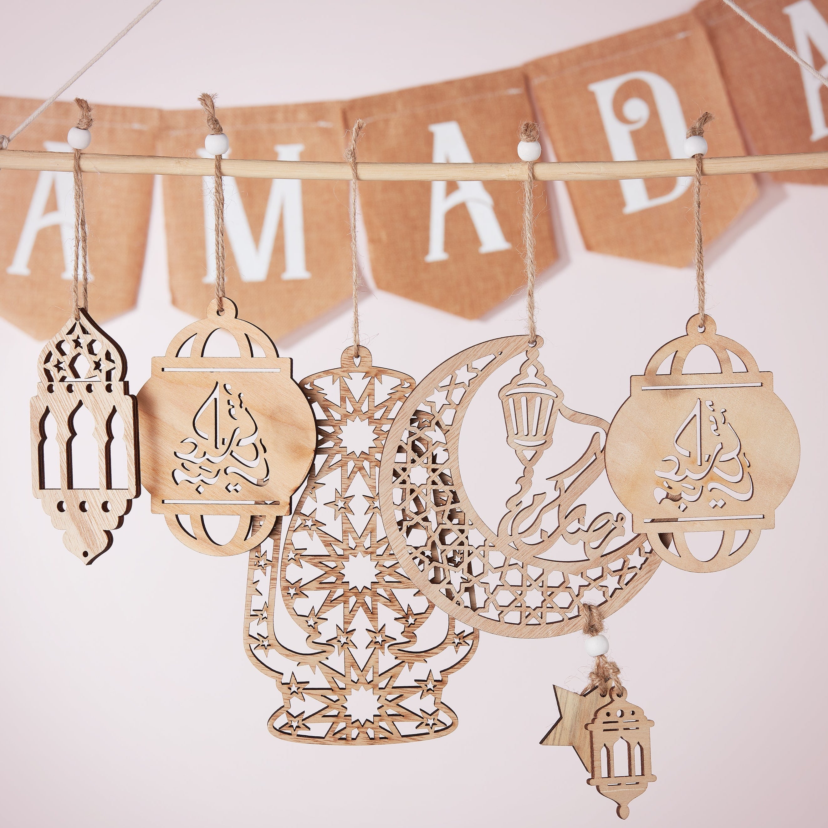 • Pack of 2 wooden Eid Mubarak hanging crescent moon decorations