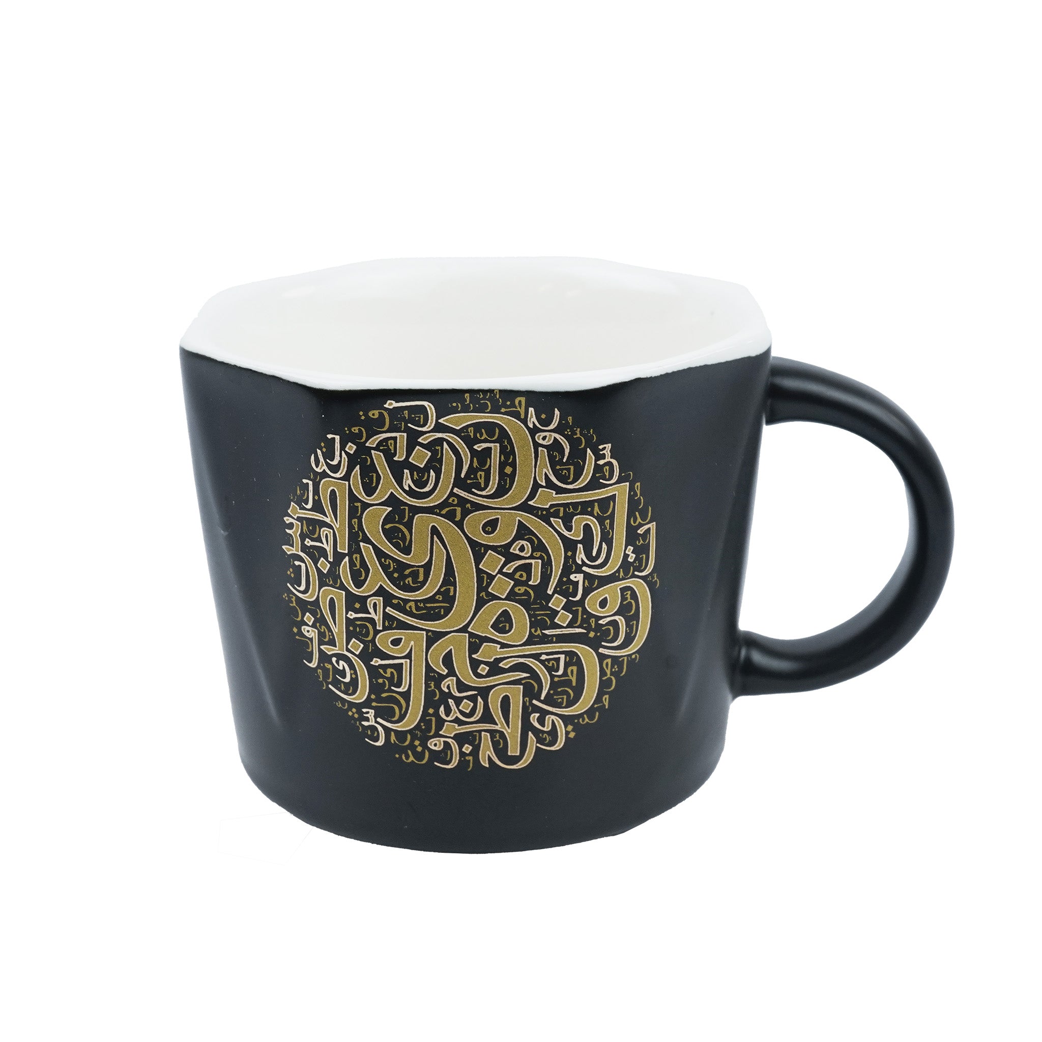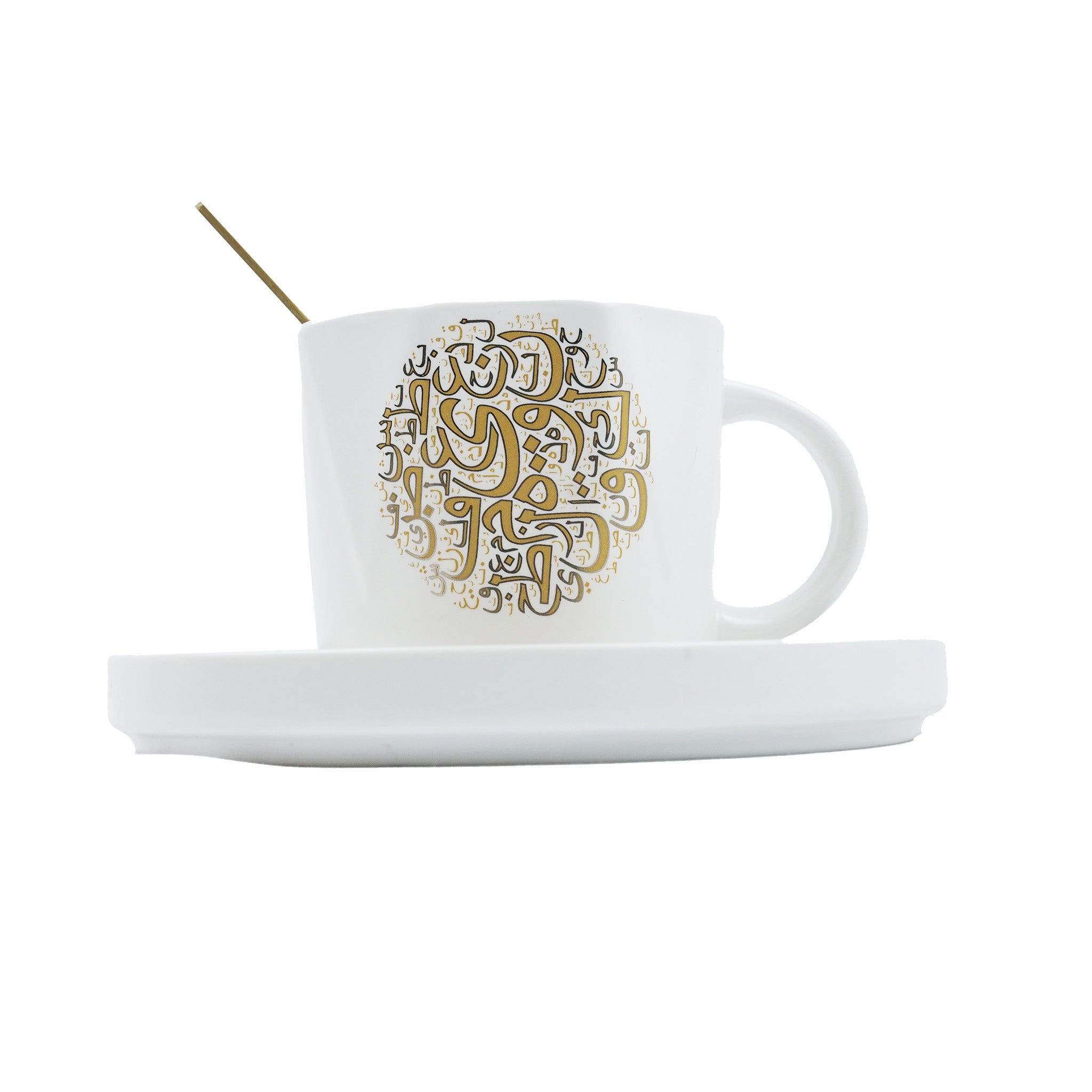 • A ceramic coffee mug & dish gift set printed with Gold calligraphy designs