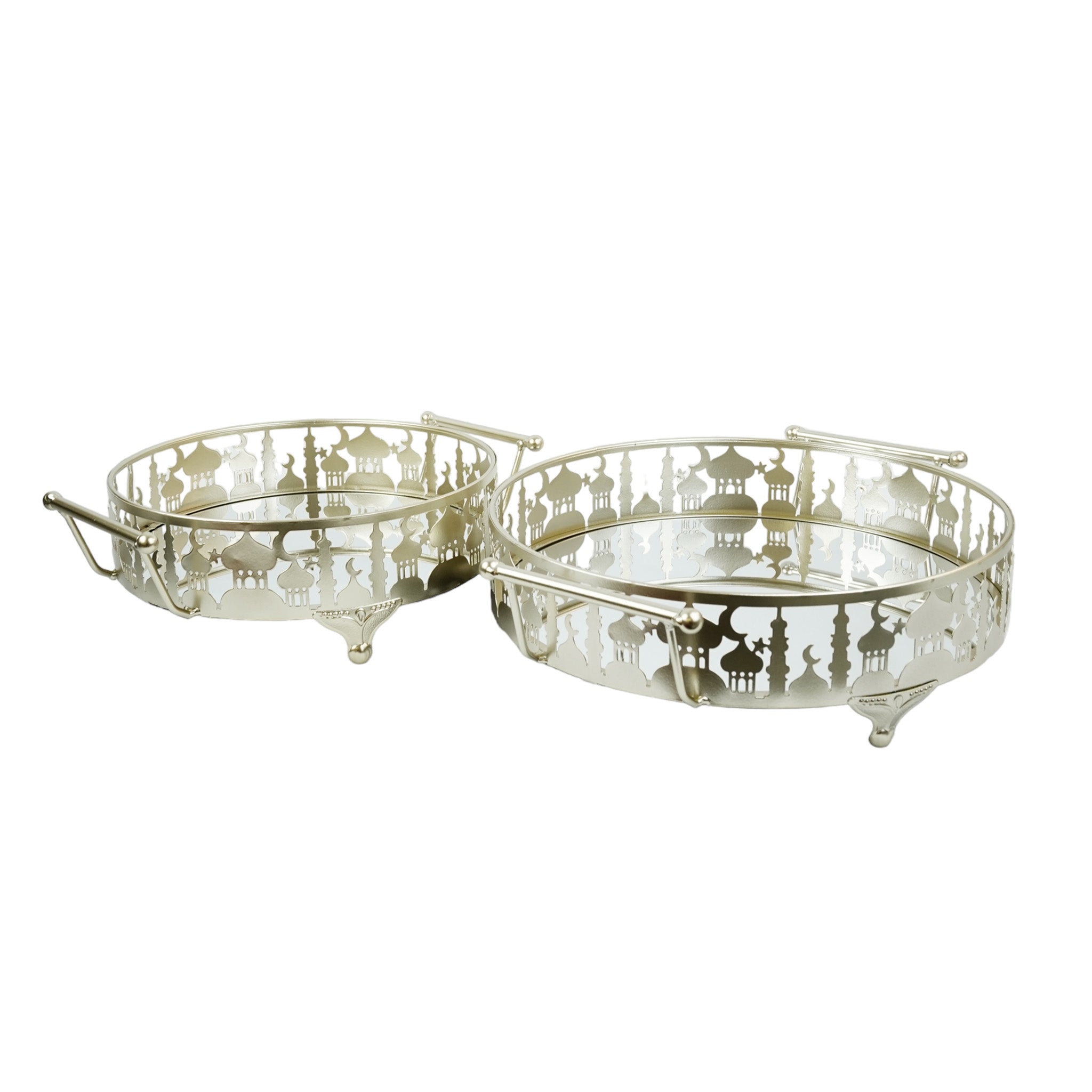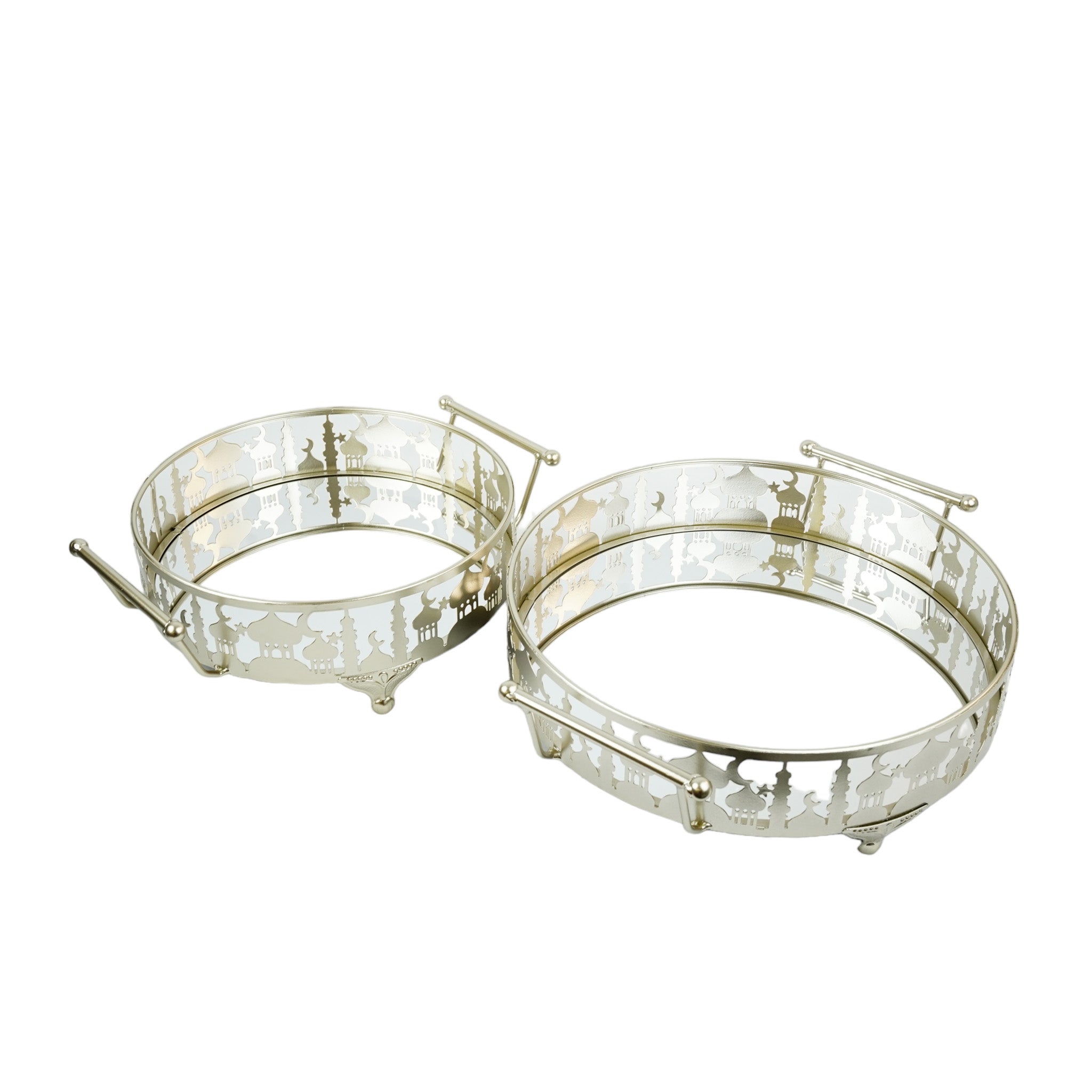 Set of 2 Gold Metal & Mirror Round Cut Out Cake / Treat Tins With Handles(757-3)