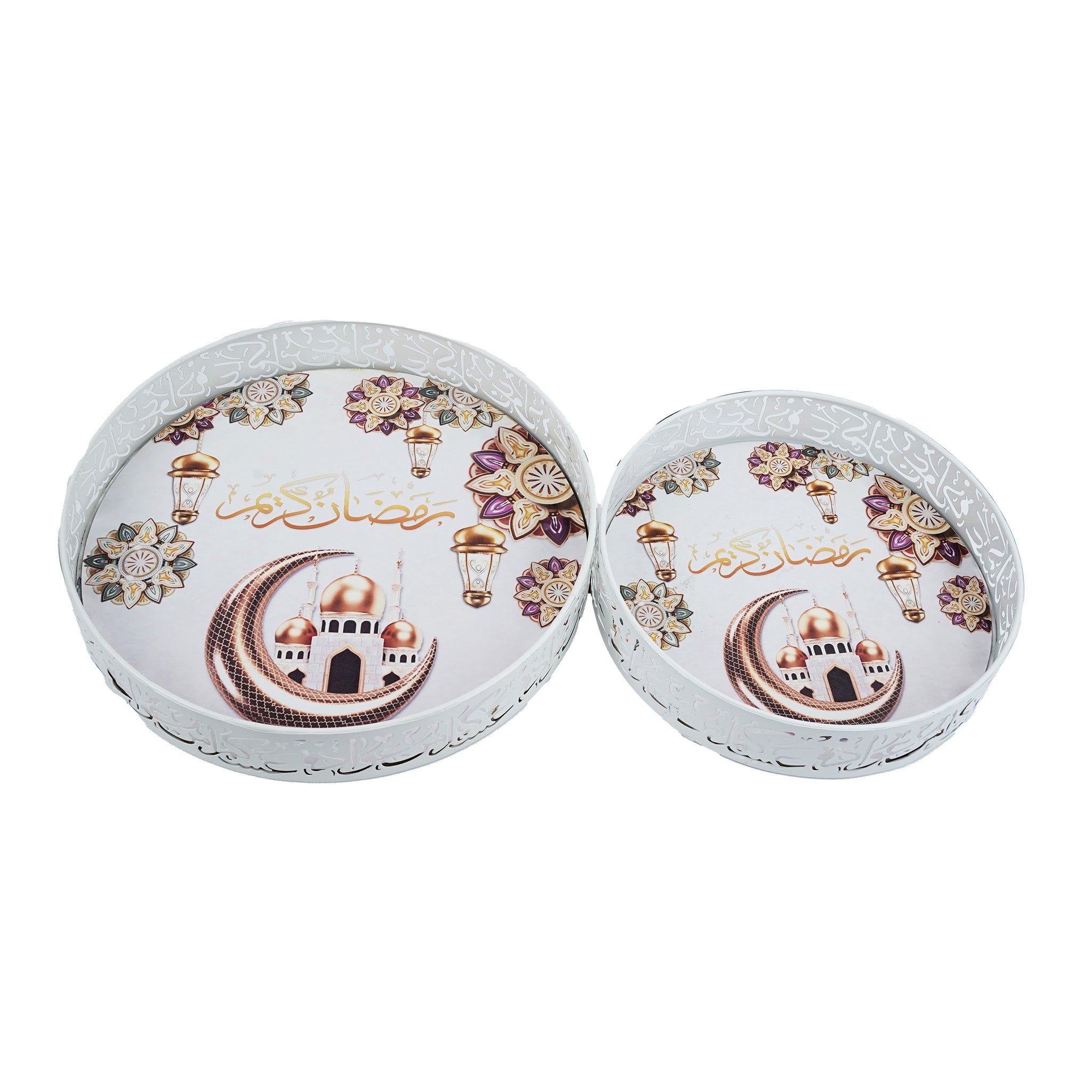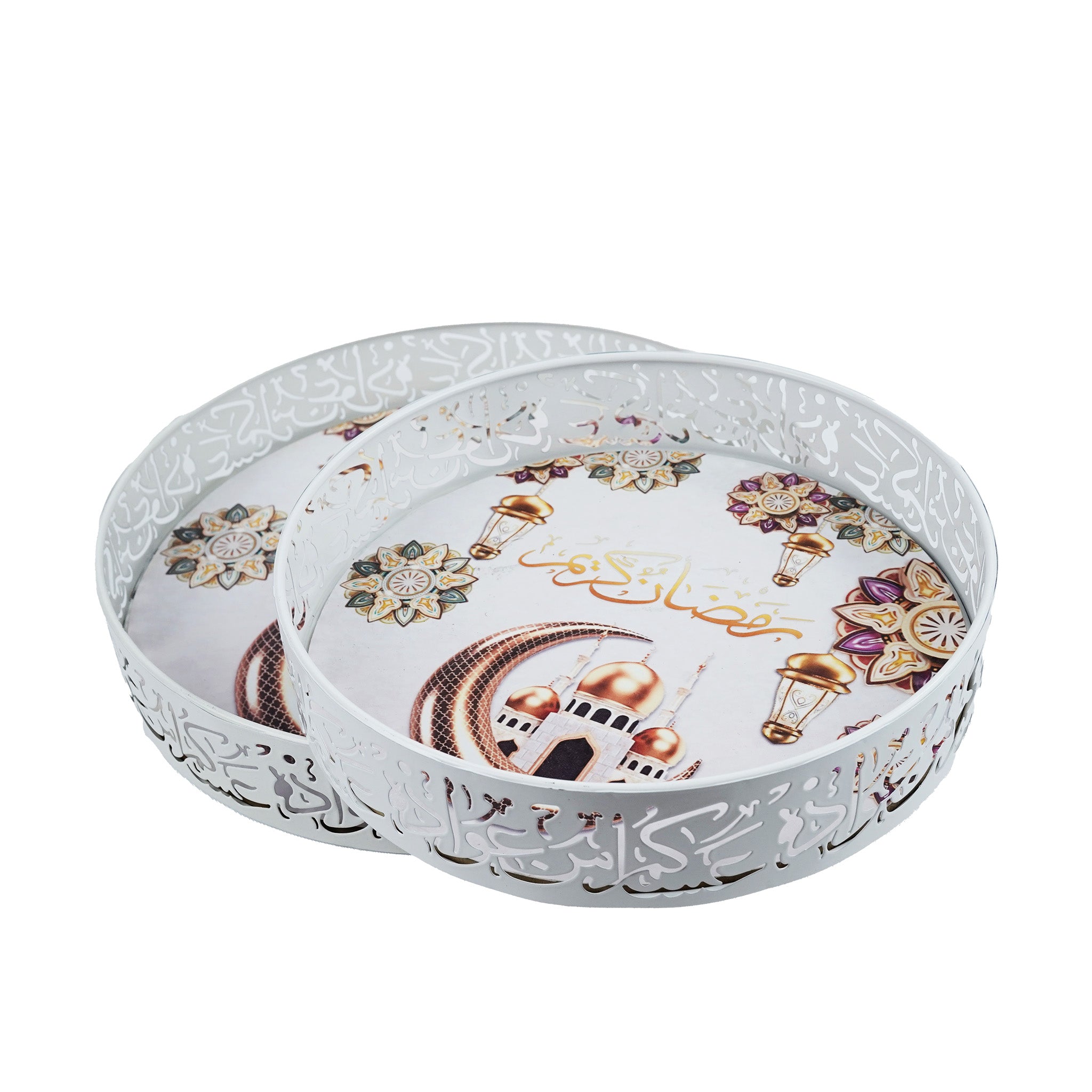 Set of 2 WHITE Metal Round ARABIC Cut Out Trays (757-27)