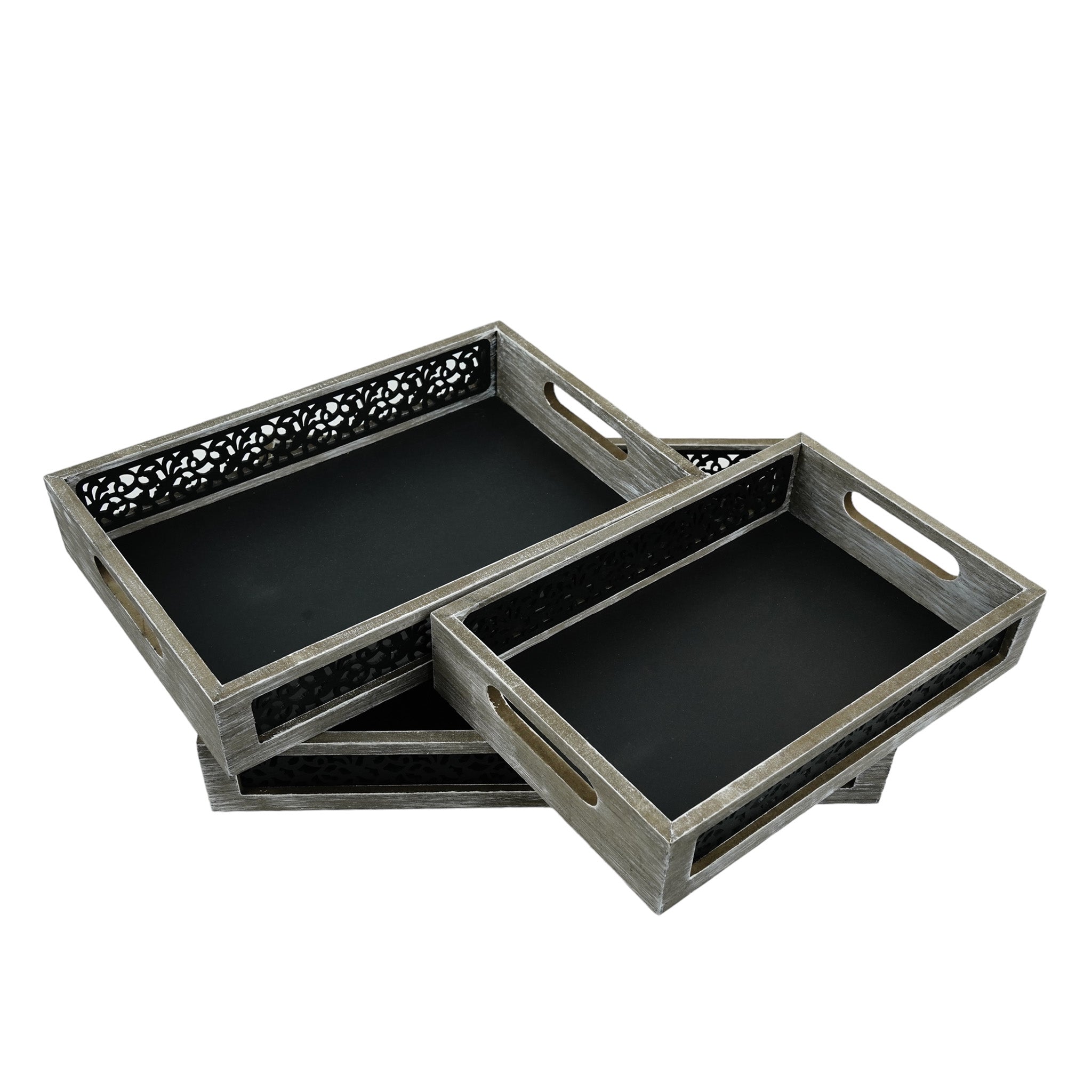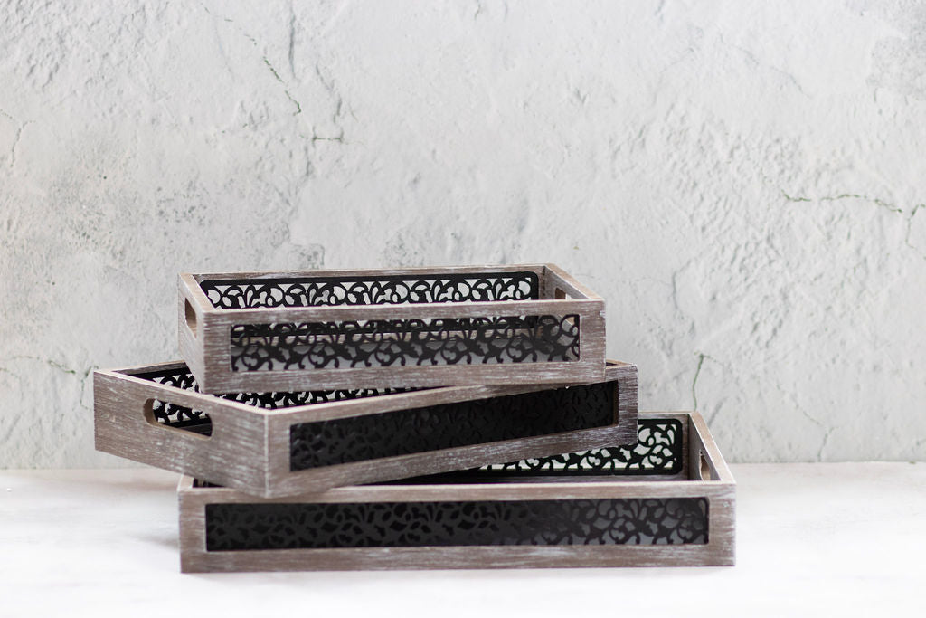• Trays are made from durable wood with a eye catching ornate cutout pattern